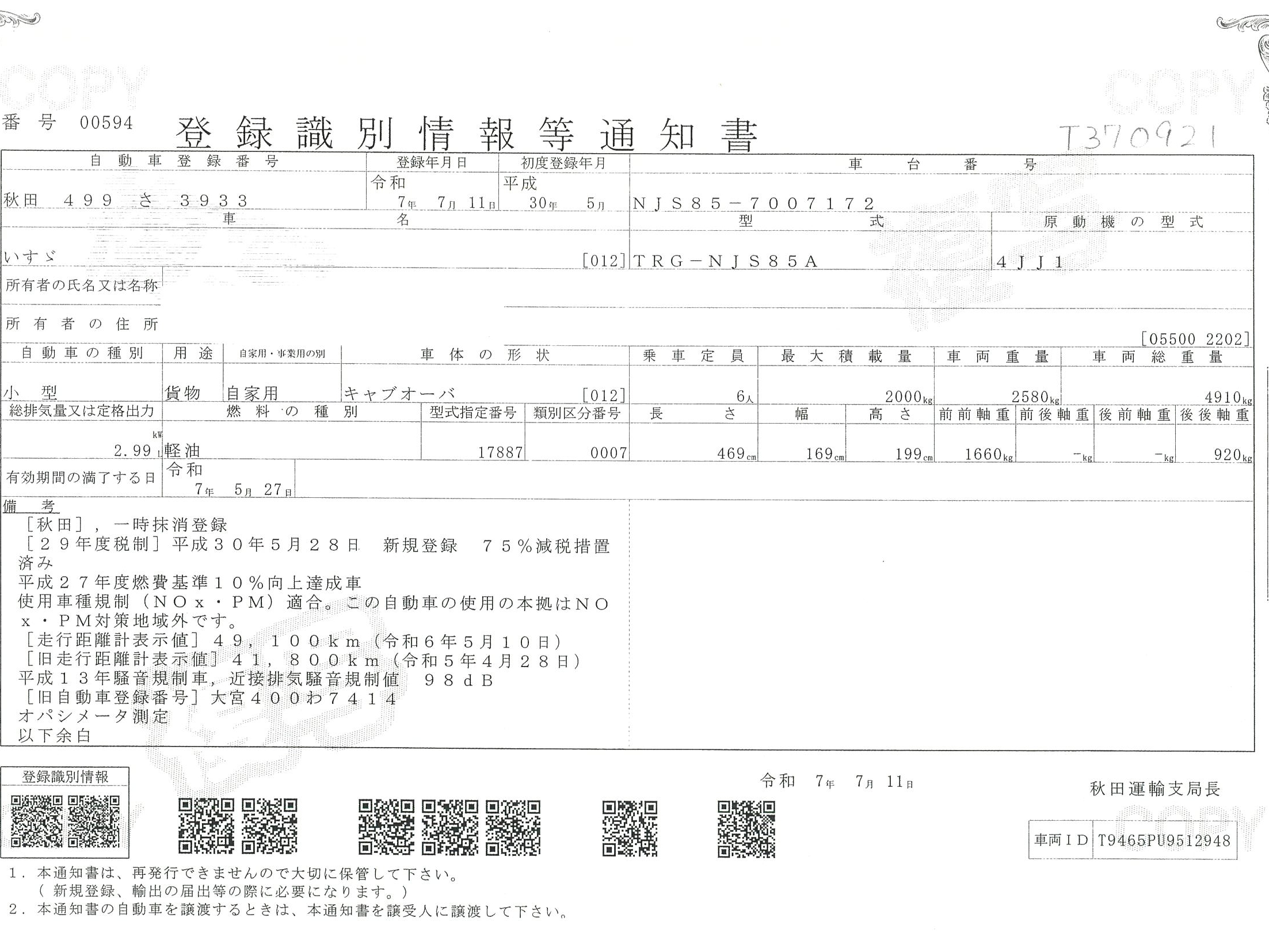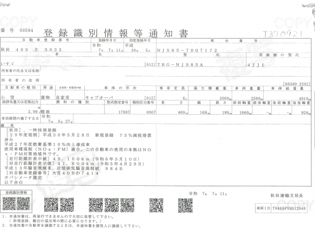 荷台高 | 375 mm | 初年度登録 | 平成 30年(2018年) | ||||||||||||||||||||||||||||||||||||||||||||