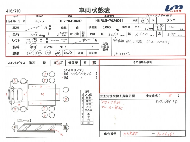 | 車台番号 | NKR85-7026061 | 馬力 | 150 PS | ||||||||||||||||||||||||||||||||||||||||||||