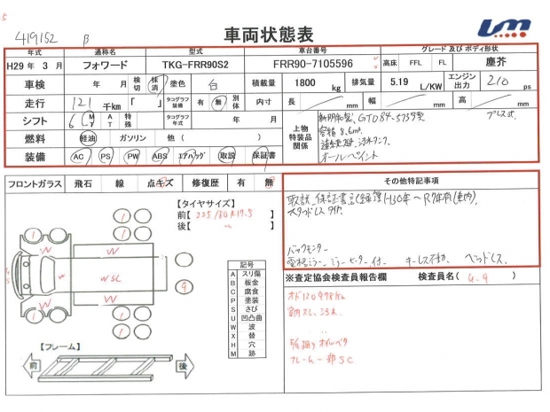| 車台番号 | FRR90-7105596 | 馬力 | 210 PS | ||||||||||||||||||||||||||||||||||||||||||||
