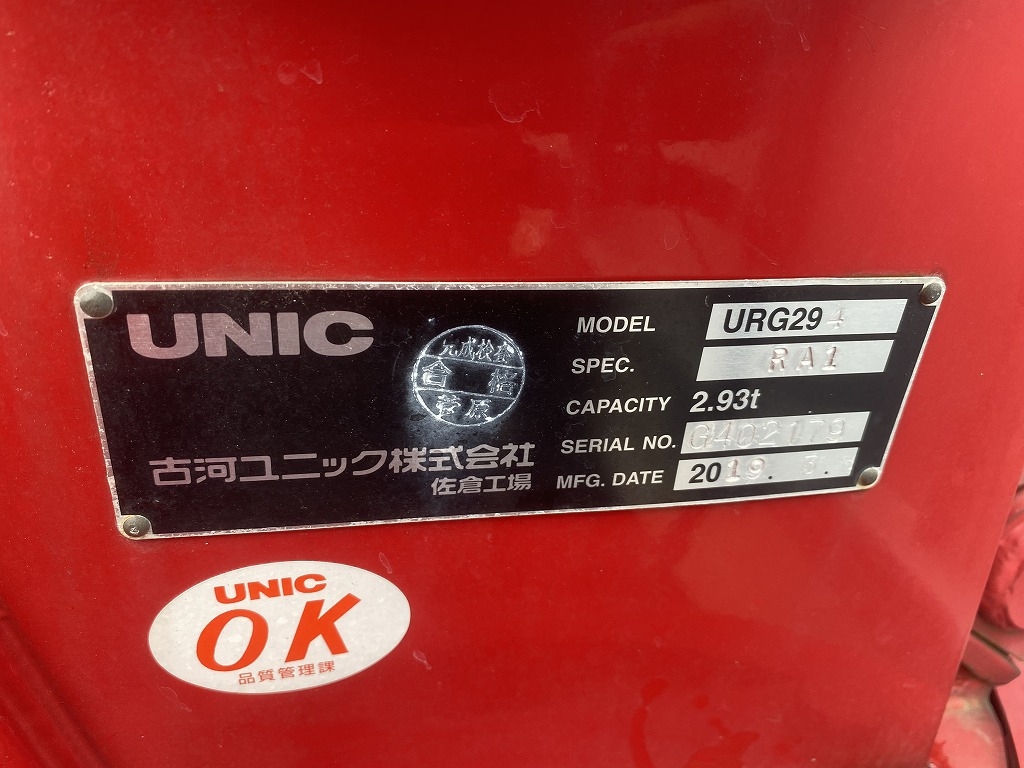 車両情報コメント ユニック URG294型 2.93t 4段 フックイン ラジコン(事務局)上物年式2019年3月 アルミブロック3方開  床縞鋼板張り 埋め込みフック12対 鳥居鉄板張り 取説・保証書・記録簿R3年~R5年有(車内) 電格ミラー キーレス付 積載量は車検証時情報になります。他写真多数有り、詳細はお問い合わせ下さい。【タイヤサイズ215/85R16】