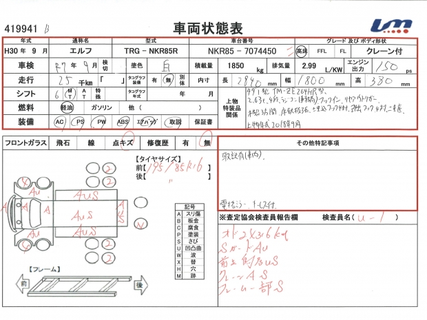 | 車台番号 | NKR85-7074450 | 馬力 | 150 PS | ||||||||||||||||||||||||||||||||||||||||||||