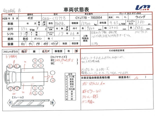 | 車両情報コメント | 日本フルハーフ製DKL型 アルミウィング ラッシング2段 引き出しフック9対 センタービーム エアサス メッキパーツ付 フロントガラス割れ有 バックモニター オートクルーズ ミラー電格・ヒーター・ワイパー有 ベット付 積載量は抹消時情報になります。他写真多数有り、詳細はお問い合わせ下さい。【タイヤサイズ 245/70R19.5】 | ||||||||||||||||||||||||||||||||||||||||||||||