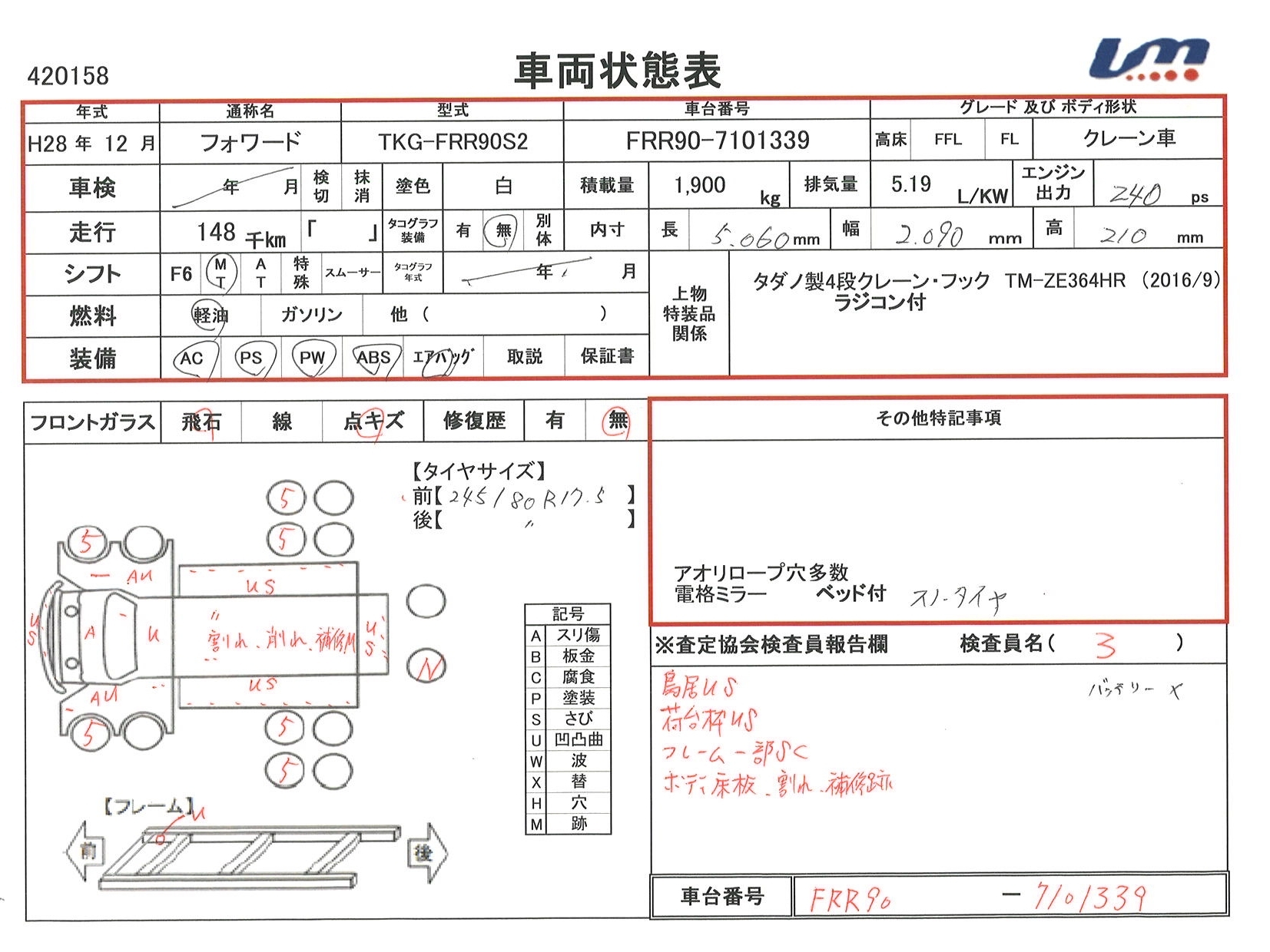 | 車台番号 | FRR90-7101339 | 馬力 | 240 PS | ||||||||||||||||||||||||||||||||||||||||||||