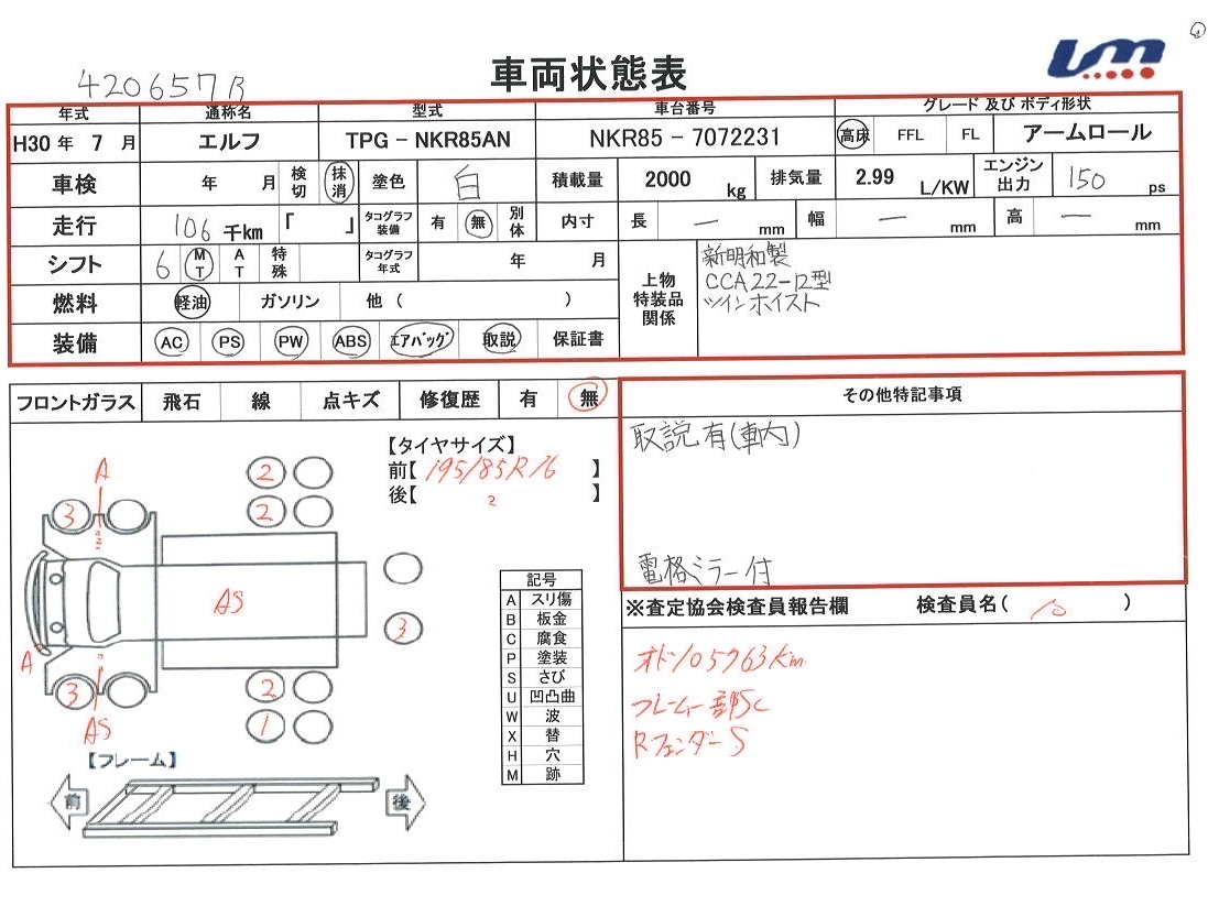 | 車台番号 | NKR85-7072231 | 馬力 | 150 PS | ||||||||||||||||||||||||||||||||||||||||||||