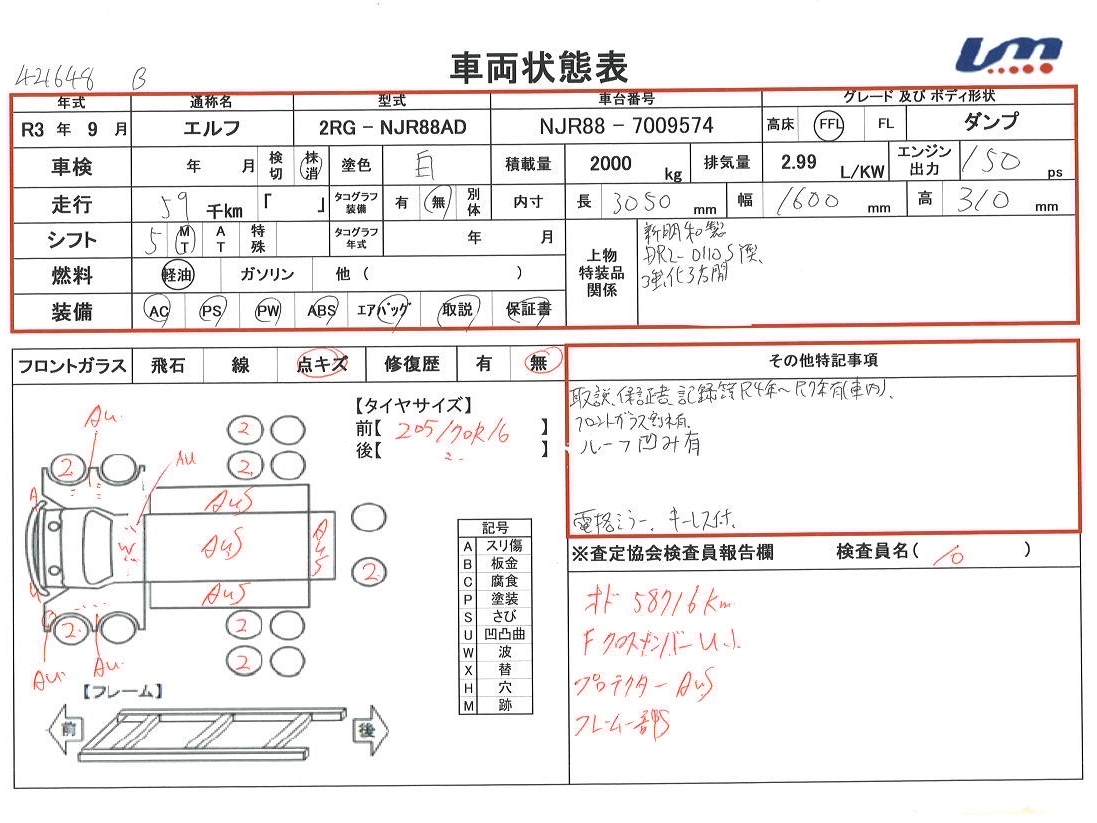 車両情報コメント | 新明和製DR2-0110SY型 強化3方開 取説・保証書・記録簿R4年~R7年有(車内)フロントガラス割れ有 ルーフ凹み有 電格ミラー キーレス付 積載量は抹消時情報になります。他写真多数有り、詳細はお問い合わせ下さい。【タイヤサイズ205/70R16】 |