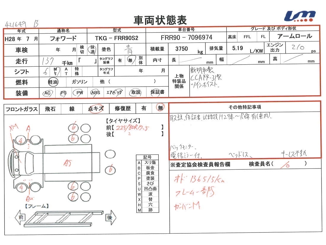 | 車台番号 | FRR90-7096974 | 馬力 | 210 PS | ||||||||||||||||||||||||||||||||||||||||||||