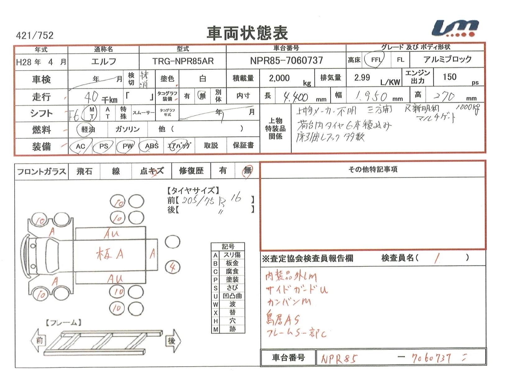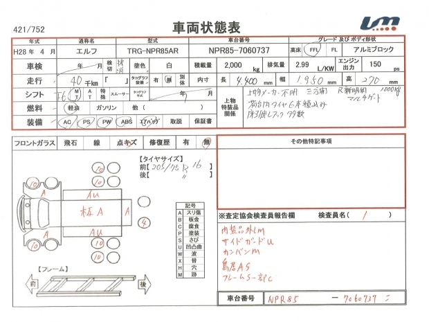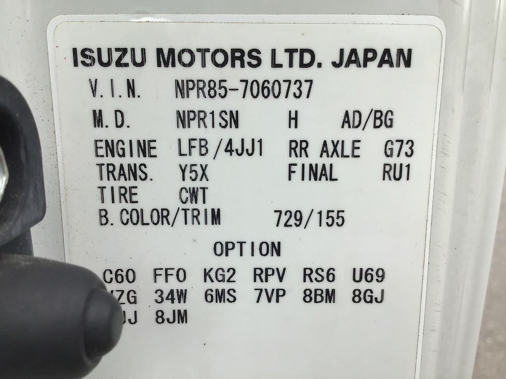 | 車台番号 | NPR85-7060737 | 馬力 | 150 PS | ||||||||||||||||||||||||||||||||||||||||||||