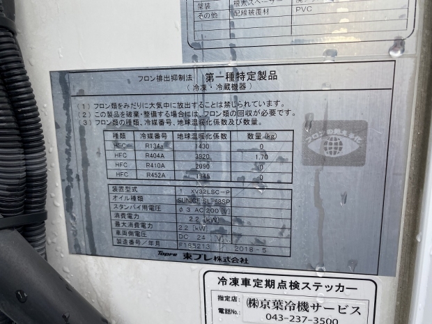 車両情報コメント | 東プレ製XV32LSC-P型 -30度設定 E/G始動時から2時間で前後36度~-11度まで確認済み サイドドア(助スライド式) スタンバイ有(車内)極東開発製CG1001H-B3MRA2型格納P/G(1000KG) 取説・保証書・記録簿R5年~R7年有(車内) シートコゲ跡 積載量は抹消時情報になります。他写真多数有り、詳細はお問い合わせ下さい。【タイヤサイズ 195/85R16】 |