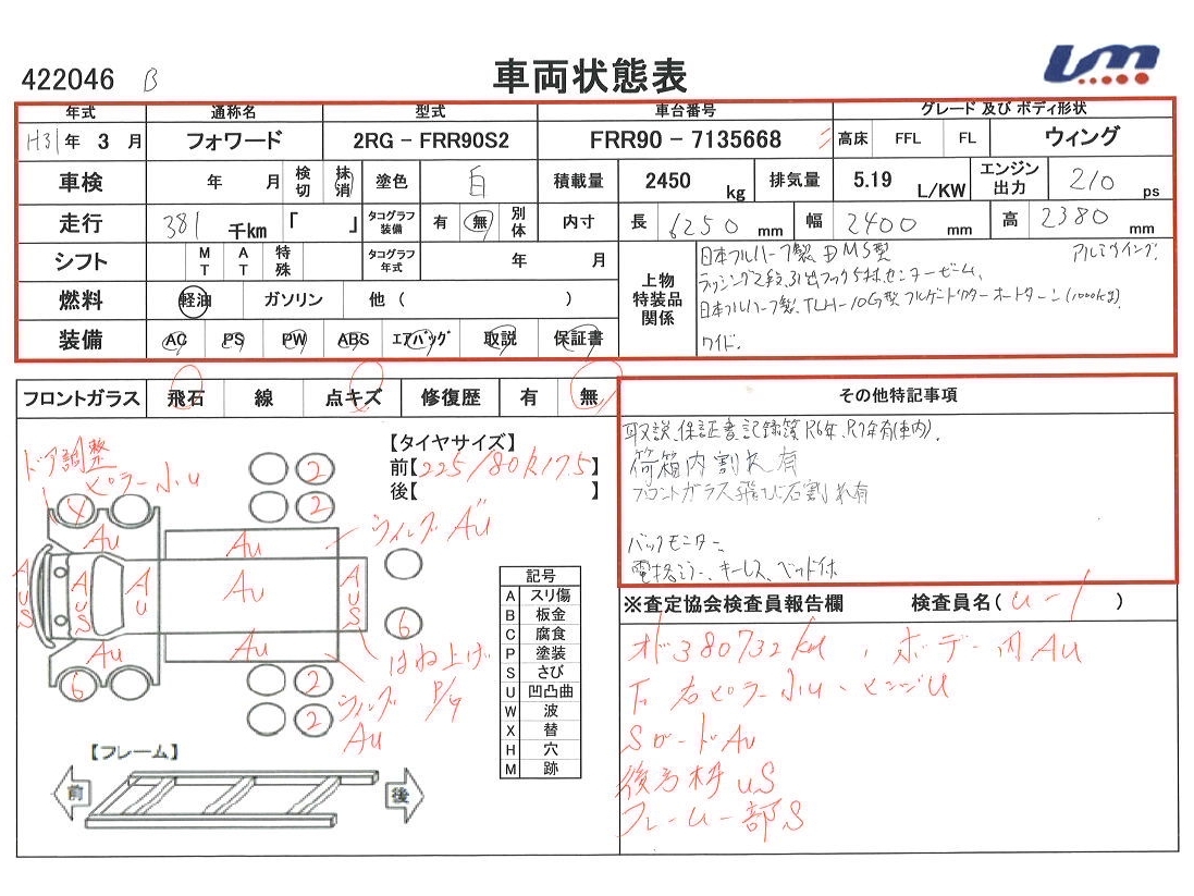 | 車両情報コメント | 日本フルハーフ製DMS型 アルミウィング ラッシング2段 引き出しフック5対 センタービーム 日本フルハーフ製TLH-10G型フルゲートリフターオートターンP/G(1000KG)取説・保証書・記録簿R6年・R7年有(車内)荷箱内割れ有 フロントガラス飛石割れ有 バックモニター ベット付 積載量は抹消時情報になります。他写真多数有り、詳細はお問い合わせ下さい。【タイヤサイズ 225/80R17.5】 | ||||||||||||||||||||||||||||||||||||||||||||||