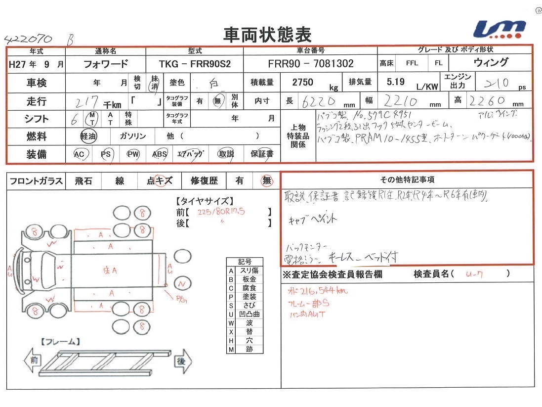 | 車台番号 | FRR90-7081302 | 馬力 | 210 PS | ||||||||||||||||||||||||||||||||||||||||||||