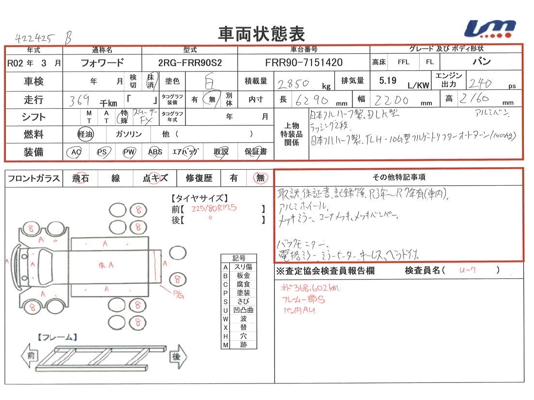 | 車台番号 | FRR90-7151420 | 馬力 | 210 PS | ||||||||||||||||||||||||||||||||||||||||||||