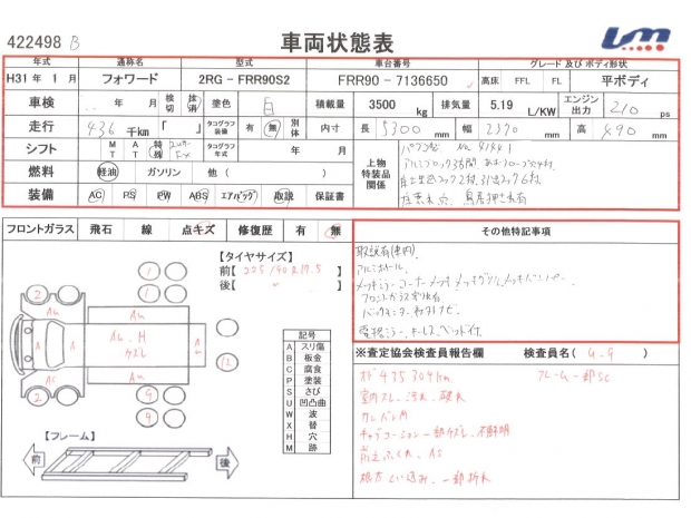 | 車台番号 | FRR90-7136650 | 馬力 | 210 PS | ||||||||||||||||||||||||||||||||||||||||||||