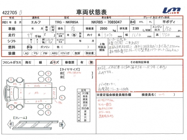 | 車台番号 | NKR85-7085047 | 馬力 | 150 PS | ||||||||||||||||||||||||||||||||||||||||||||