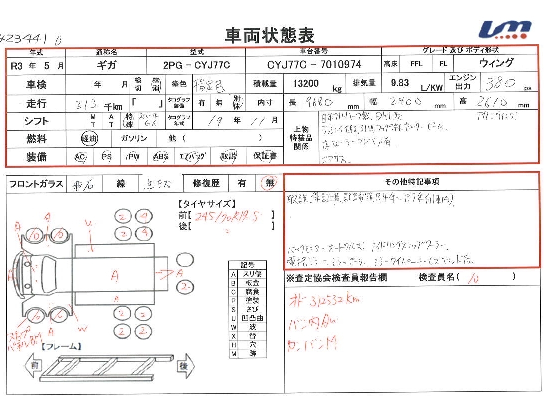 | ボディ内寸 | 荷台長 | 9,680 mm | 走行距離 | 313,000 km | |||||||||||||||||||||||||||||||||||||||||||