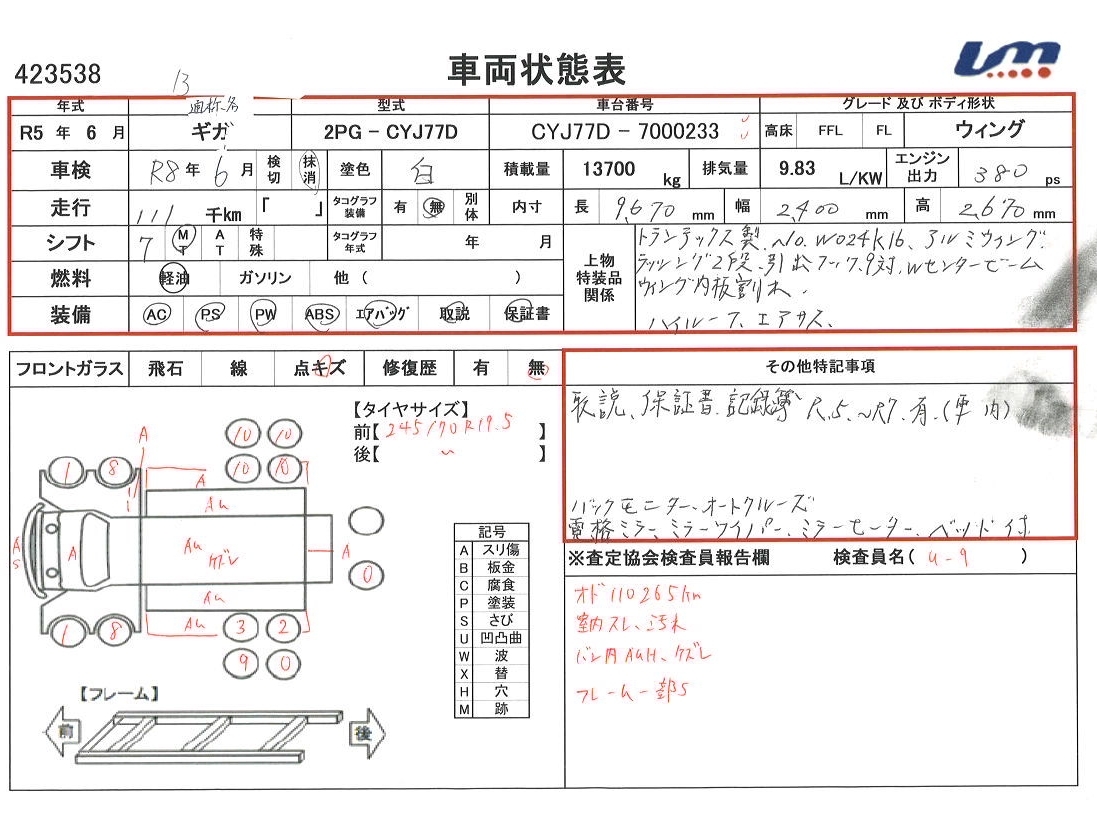 | ボディ内寸 | 荷台長 | 9,670 mm | 走行距離 | 111,000 km | |||||||||||||||||||||||||||||||||||||||||||