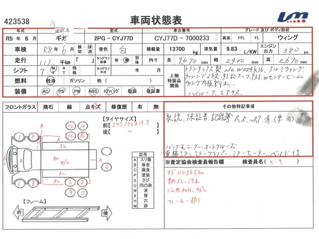 | 車両情報コメント | トランテックス製NO、W024K16 アルミウィング ラッシング2段 引き出しフック9対 Wセンタービーム ウィング内板割れ ハイルーフ エアサス 取説・保証書・記録簿R5年~R7年有(車内) バックモニター オートクルーズ ミラー電格・ヒーター・ワイパー ベット付 積載量は車検証情報になります。他写真多数有り、詳細はお問い合わせ下さい。【タイヤサイズ 245/70R19.5】 | ||||||||||||||||||||||||||||||||||||||||||||||