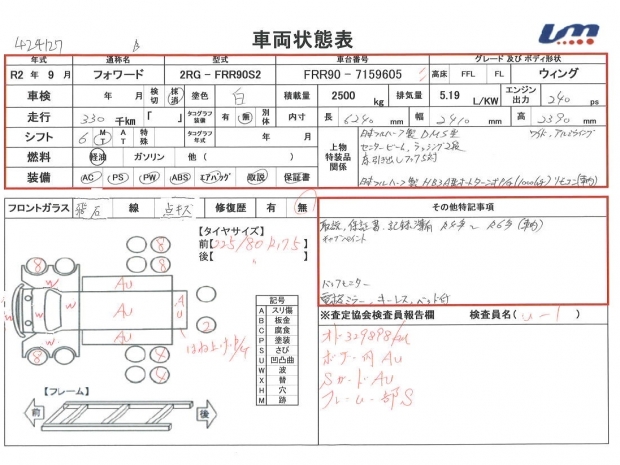 | 車台番号 | FRR90-7159605 | 馬力 | 240 PS | ||||||||||||||||||||||||||||||||||||||||||||