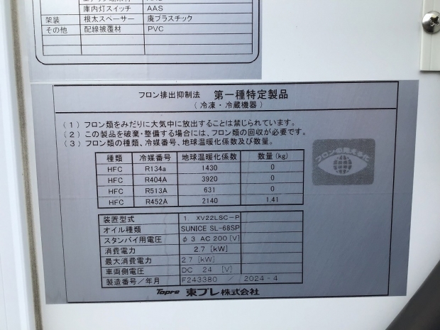 | 車両情報コメント | 東プレ製XV22LSCーP型 -30℃設定 ラッシング2段 床ステンレス E/G1時間で前18℃~-17℃ 後19℃~-16℃確認済 水抜き穴前後2ヶ所 サイドドア(助、スライド式)スタンバイ有(コード欠) 上物年式2024年4月 取説有(車内) バックモニター 電格ミラー キーレス付 積載量は抹消時情報になります。他写真多数有り、詳細はお問い合わせ下さい。【タイヤサイズ175/75R15】 | ||||||||||||||||||||||||||||||||||||||||||||||