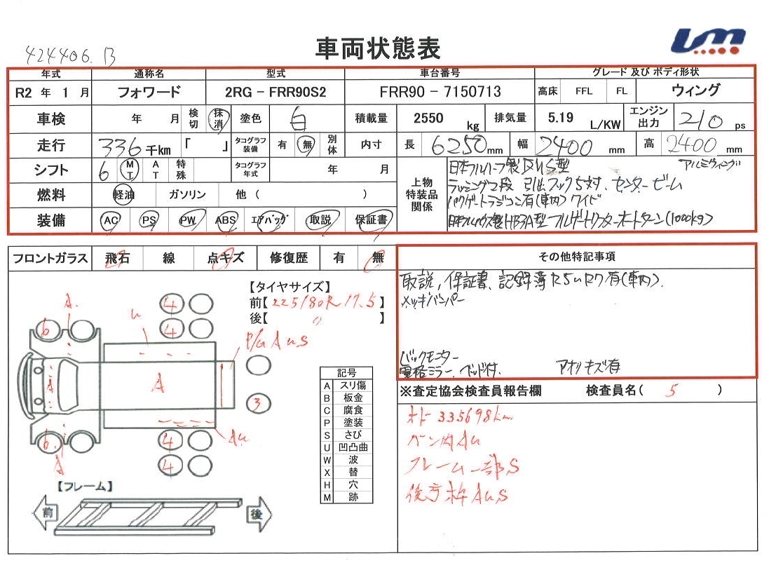| 車台番号 | FRR90-7150713 | 馬力 | 210 PS | ||||||||||||||||||||||||||||||||||||||||||||