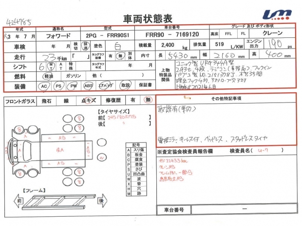 | 車台番号 | FRR90-7169120 | 馬力 | 190 PS | ||||||||||||||||||||||||||||||||||||||||||||