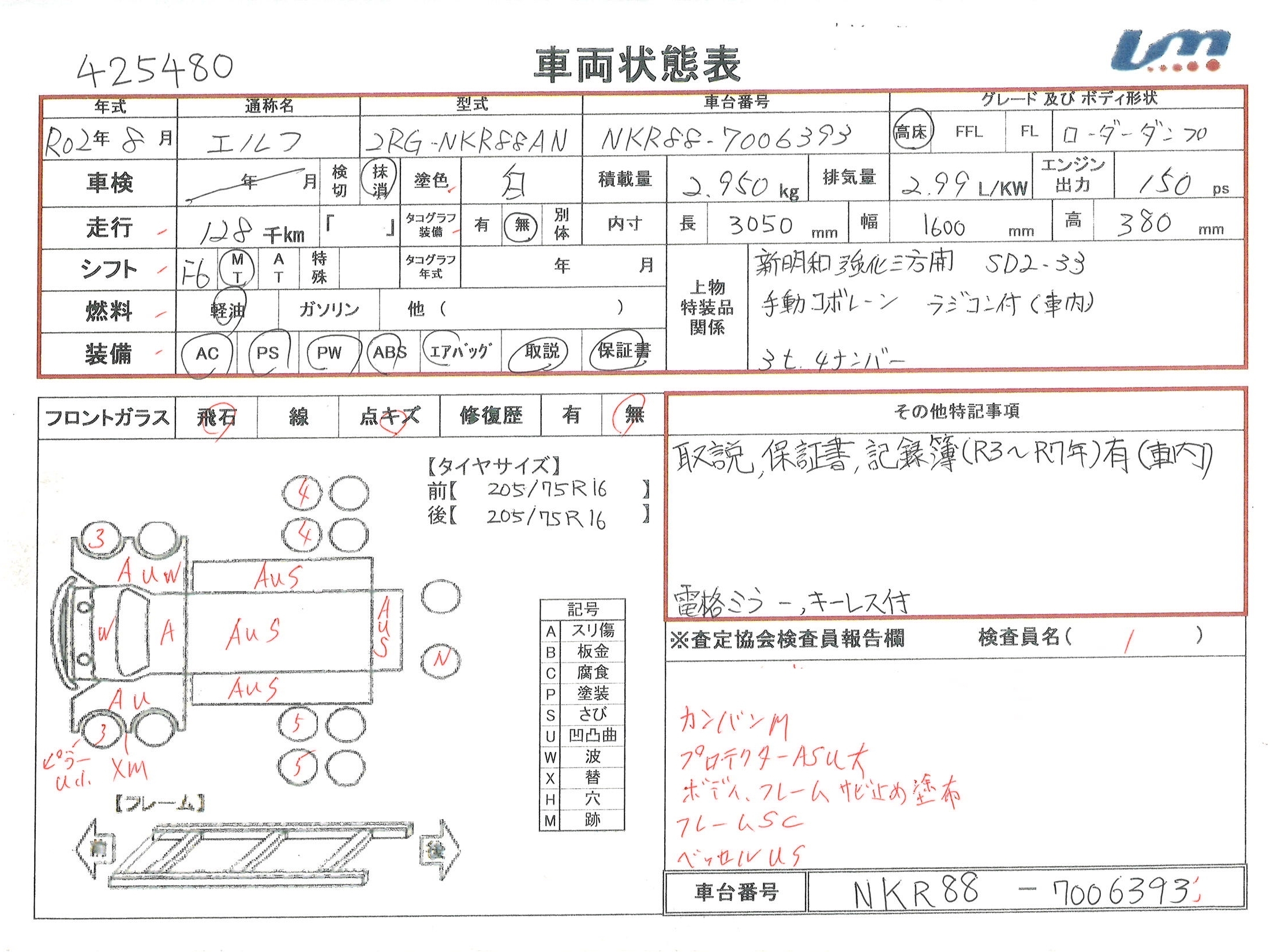 | 車台番号 | NKR88-7006393 | 馬力 | 150 PS | ||||||||||||||||||||||||||||||||||||||||||||
