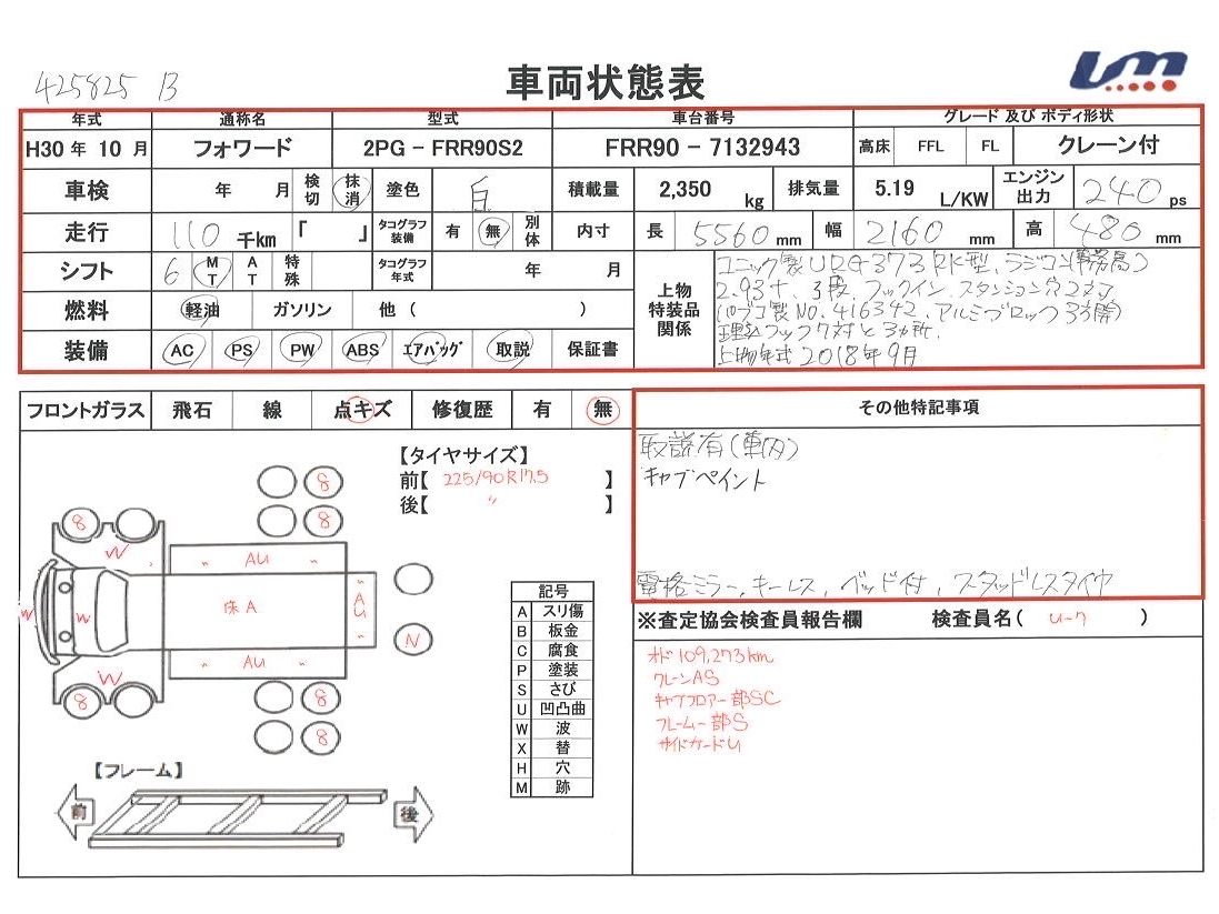 | 車台番号 | FRR90-7132943 | 馬力 | 240 PS | ||||||||||||||||||||||||||||||||||||||||||||