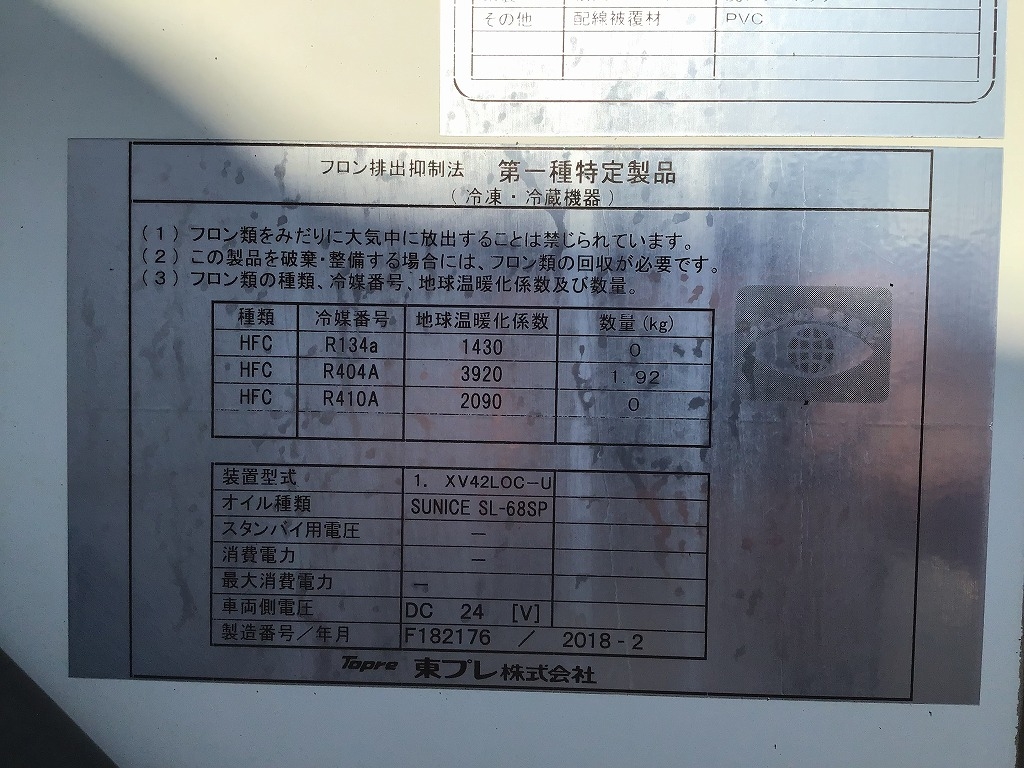 | 車両情報コメント | 東プレ製XV42LOCーU型 -30℃設定 ラッシング2段 床縞鋼板張 上物年式2018年2月 E/G始動後1時間で前14℃後17℃~前-5℃後-4℃確認済 Fガラス割れ有 取説・保証書・記録簿H30年~R6年有(車内) 極東開発製CG1002LーB3MRA2型格納ゲート(1000KG) 積載量は抹消時情報になります。他写真多数有り、詳細はお問い合わせ下さい。【タイヤサイズ225/80R17.5】 | ||||||||||||||||||||||||||||||||||||||||||||||