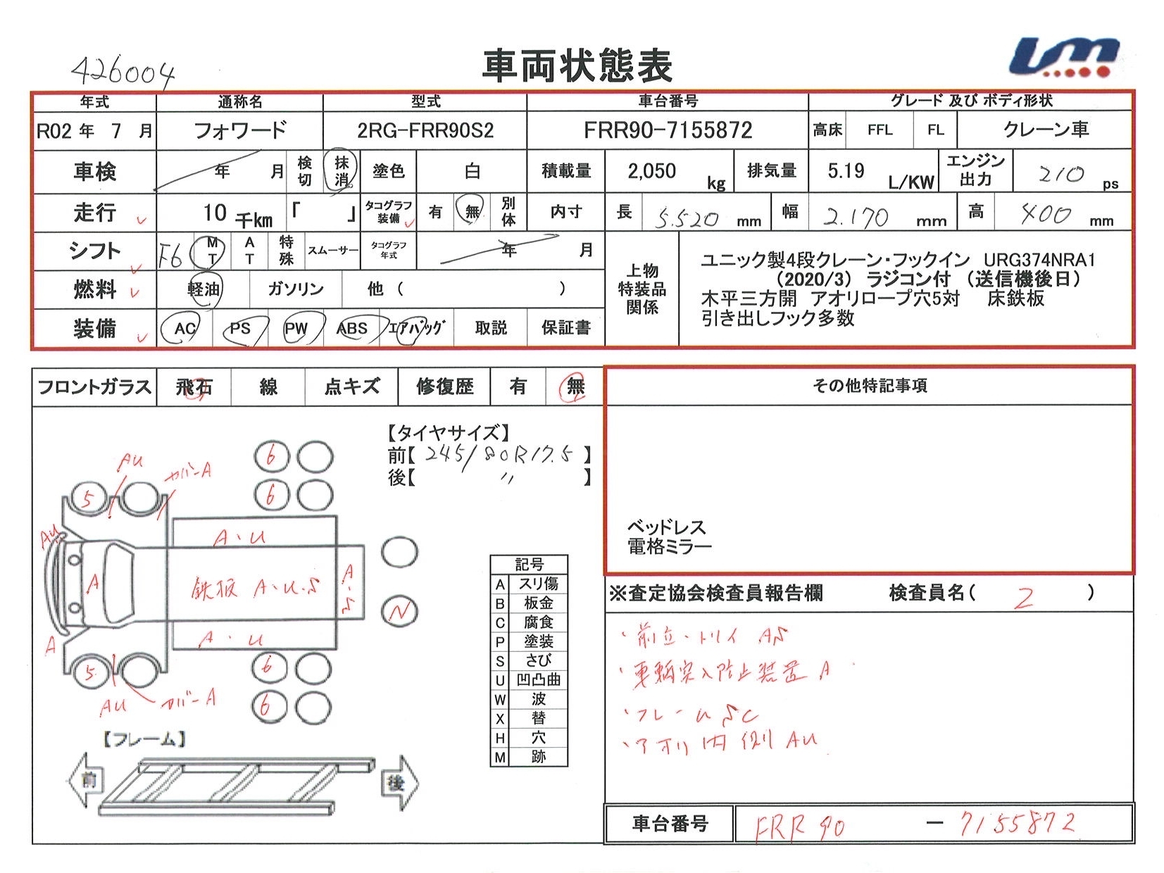 | 車台番号 | FRR90-7155872 | 馬力 | 210 PS | ||||||||||||||||||||||||||||||||||||||||||||