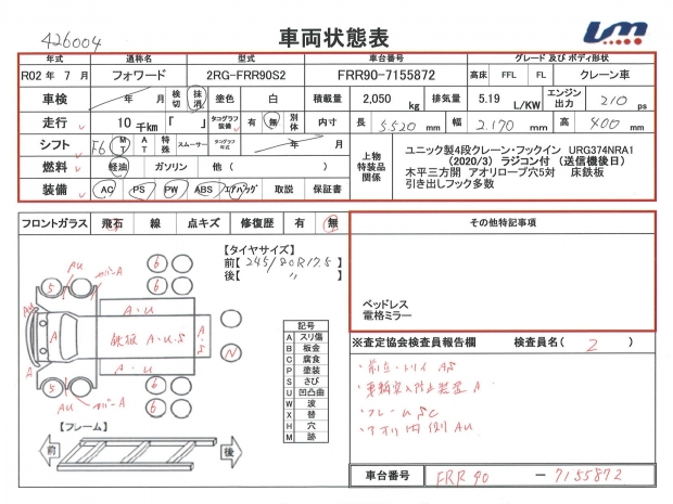 | 車両情報コメント | ユニック製4段クレーン フックイン URG374NRA1(2020/3) ラジコン付(送信機後日) 木平三方開 アオリロープ穴5対 床鉄板 引き出しフック多数 ベッドレス 電格ミラー 前立、トリイ傷・錆 車輌突入防止装置傷 フレーム錆・腐食 アオリ内側傷・凹み 積載量は抹消時情報になります。他写真多数有り、詳細はお問い合わせ下さい。【タイヤサイズ 245/80R17.5】 | ||||||||||||||||||||||||||||||||||||||||||||||