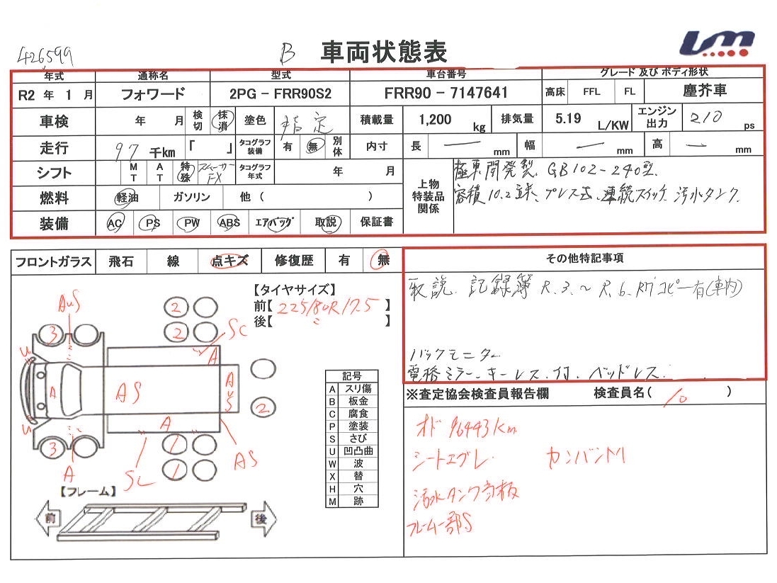 | 車台番号 | FRR90-7147641 | 馬力 | 210 PS | ||||||||||||||||||||||||||||||||||||||||||||