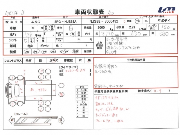 | ボディ内寸 | 荷台長 | 3,130 mm | 走行距離 | 138,000 km | |||||||||||||||||||||||||||||||||||||||||||