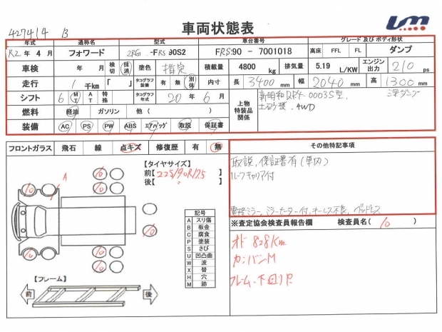 | 車両情報コメント | 新明和製DR4―0003S型 深ダンプ 土砂禁 4WD 取説・保証書有(車内) ルーフキャリア付 電格ミラー ミラーヒーター付 キーレス不良 ベッドレス 積載量は抹消時情報になります。他写真多数有り、詳細はお問い合わせ下さい。【タイヤサイズ225/90R17.5】 | ||||||||||||||||||||||||||||||||||||||||||||||