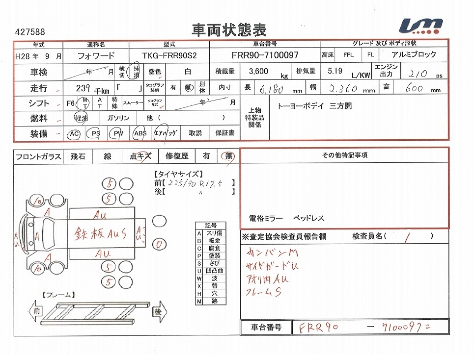 | 車台番号 | FRR90-7100097 | 馬力 | 210 PS | ||||||||||||||||||||||||||||||||||||||||||||
