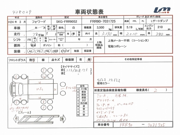 | 車台番号 | FRR90-7031725 | 馬力 | 210 PS | ||||||||||||||||||||||||||||||||||||||||||||