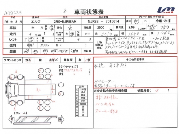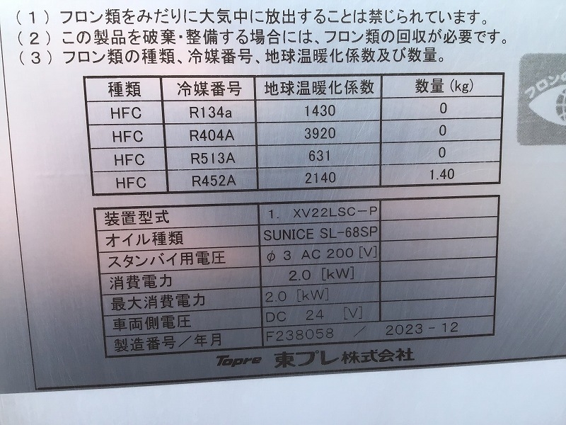 車両情報コメント 東プレ製XV22LSCーP型 -30℃設定 ラッシング1段 床ステンレス サイドドア(助、スライド式) スタンバイ(コード有車内) 水抜き穴前2ヶ所 E/G始動後1時間で15℃~-23℃まで確認済 取説有(車内) バックモニター キーレス付 積載量は抹消時情報になります。他写真多数有り、詳細はお問い合わせ下さい。【タイヤサイズ195/75R15】